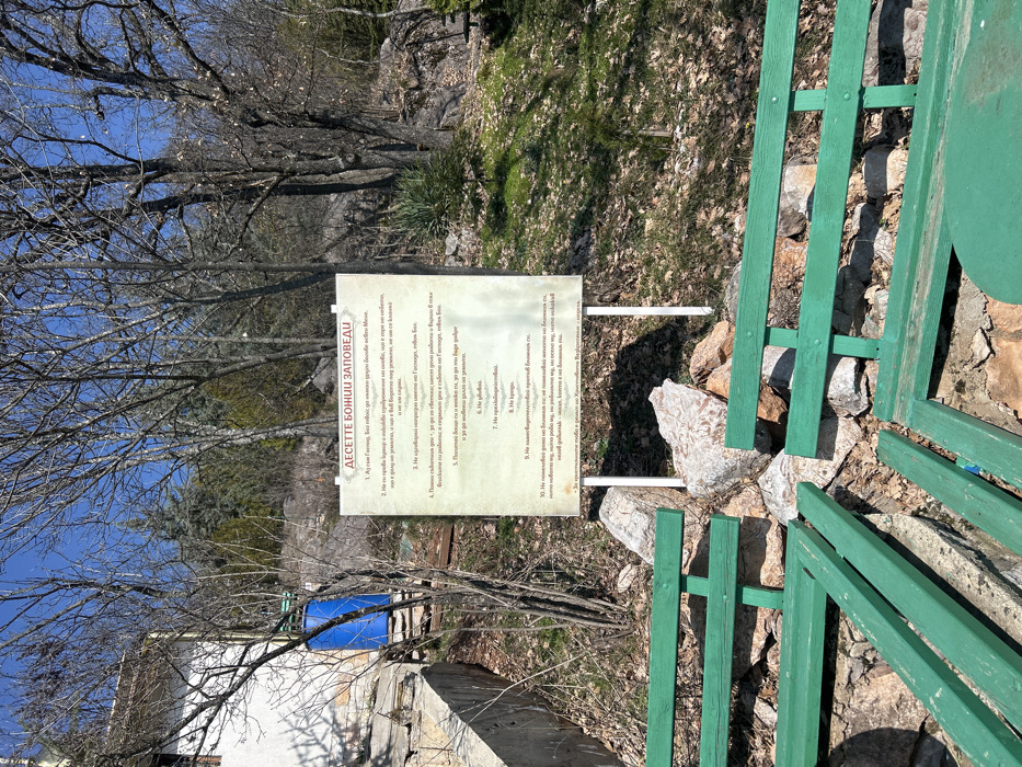The image depicts an outdoor scene in Novo Selo, Bulgaria, under clear blue skies. A prominent rectangular white sign, supported by two white posts, is positioned slightly right of the frame's center. The sign displays text in Bulgarian, titled "ДЕСЕТТЕ БОЖИИ ЗАПОВЕДИ" (The Ten Commandments). In the foreground, parts of several green wooden benches and a matching green wooden table are visible. The ground surrounding the sign and furniture is uneven, consisting of soil, scattered dry leaves, small rocks, and sparse green growth. To the left, a light-colored building or wall structure is partially visible, with a blue plastic barrel situated near it. The midground and background are dominated by a mix of deciduous trees with bare branches and evergreen trees. The terrain behind the sign appears to slope upwards. The scene is brightly illuminated by natural sunlight, casting distinct shadows. No individuals are present in the image.