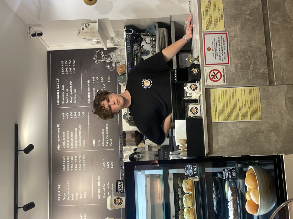 This image captures the interior of a cafe identified as "BON-BON Cafe & Bakery" in Budva, Montenegro. A young male with short, curly brown hair stands behind a service counter, facing the viewer with a neutral expression. He wears a black short-sleeved t-shirt with the cafe's logo on the left chest. His left hand is placed on his hip, and his right hand rests on the counter surface. Behind him, a large black menu board is affixed to the wall, detailing various beverages, including teas, alternative drinks, lemonades, and specialty items, with prices denominated in Euros. To the male's right, an espresso machine and coffee grinder are visible, along with multiple ceramic cups and glasses arranged on shelving. To his left, a refrigerated display case contains several baked goods, including pistachio rolls, chocolate cakes, and apple charlottes, with prices marked. Below the baked goods, a wooden bowl filled with oranges is displayed. The counter features additional items such as a utensil holder, branded merchandise, and two prominent informational signs in Montenegrin, one prohibiting smoking and another forbidding the sale of alcoholic beverages to individuals under 18 years of age. Overhead, two black track lights illuminate the scene, and a small security camera is mounted on the ceiling.