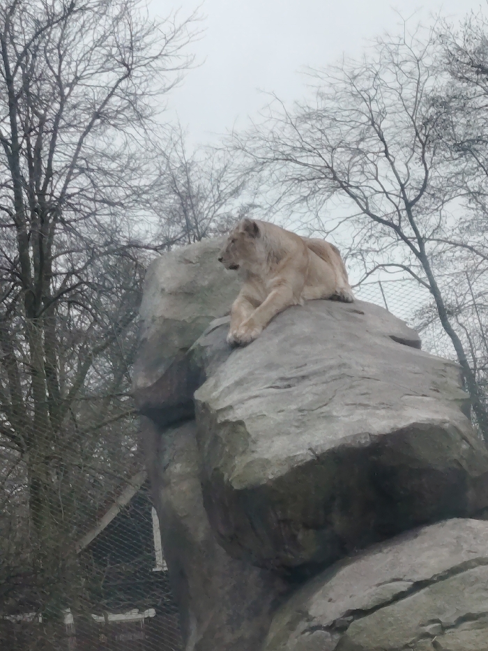 A light-colored lioness is depicted resting atop a multi-tiered grey rock formation, positioned in the center-right of the frame. The animal lies prone, facing left, with its front paws extended and crossed. Its gaze is directed towards the left, indicating alertness. The background consists of numerous bare deciduous trees with intricate branch networks against an overcast, light grey sky. To the lower left, a section of wire mesh fencing and a partial view of a building structure are discernible. The scene is located within Diergaarde Blijdorp (Rotterdam Zoo) in Rotterdam, Netherlands, during a period when trees are without foliage.
