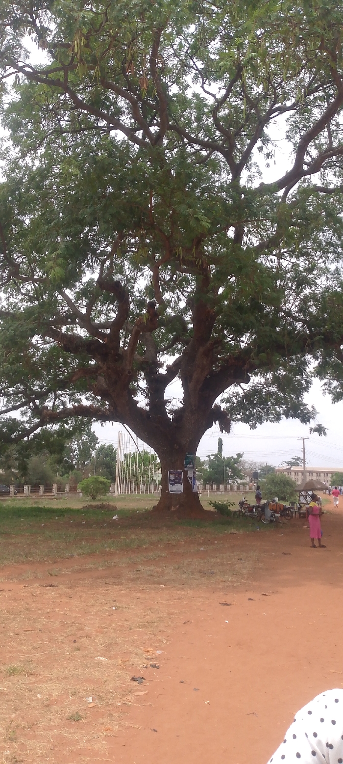 The image depicts an outdoor scene dominated by a massive, mature tree with a broad, leafy canopy and thick, gnarled branches, positioned centrally and extending into the upper frame. The tree's trunk, visible in the lower center, has several laminated posters affixed to its right side. The ground in the foreground and midground consists of reddish-brown dirt mixed with patches of dry, sparse grass and scattered debris. In the lower right foreground, a portion of a person's upper body, wearing a white garment with black polka dots, is visible. To the right of the tree's base, multiple motorcycles are parked. Several individuals are present: a person in a pink garment stands near the motorcycles, facing left, while another individual in a dark top and light bottom stands closer to the vehicles. Further right, an individual wearing a white top and dark bottom walks away from the camera. A rudimentary shade structure, possibly a vendor's stall, with a dark roof, is partially visible behind these individuals. Additional figures are observed walking in the far right background, some wearing red. To the left of the tree, a low concrete barrier or fence runs horizontally. Beyond it, a light-colored surface, possibly a road, features a dark vehicle. A prominent monument, composed of numerous white, vertical rectangular columns, stands further back, visible through the tree's foliage. This monument identifies the location as the **Freedom Square area within the University of Nigeria, Nsukka campus**, in Nsukka, Nigeria. The background shows an overcast sky. Distant buildings with light-colored facades and dark roofs, including a larger multi-story structure, are visible on the horizon. Utility poles and overhead power lines traverse the background.