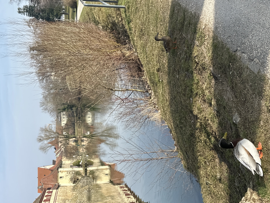 This image depicts a sunlit outdoor scene in Weißenburg in Bayern, Germany, specifically along a section of the Stadtgraben (city moat/canal). In the foreground, a light-gray paved path runs along the right side, bordered by a grassy embankment to its left. Two ducks are present on this embankment: a male Mallard, displaying a white body, black-green head, yellow bill, and orange feet, is positioned in the lower-left, facing left. Higher and to the right on the embankment, a female Mallard, characterized by mottled brown plumage and orange feet, stands also facing left. A silver metal railing is partially visible along the extreme right edge of the paved path. The midground is occupied by a calm body of water, which reflects the clear blue sky and the distant buildings. The right bank of the water is lined with a dense growth of leafless deciduous trees and shrubs. In the background, across the water on the left, several multi-story historic European-style buildings are visible, featuring red-tiled roofs and light-colored facades, some exhibiting visible timber-framing. These structures are clearly reflected in the still water. The sky is clear and light blue, indicating a bright day, and the bare trees suggest a late winter or early spring season.