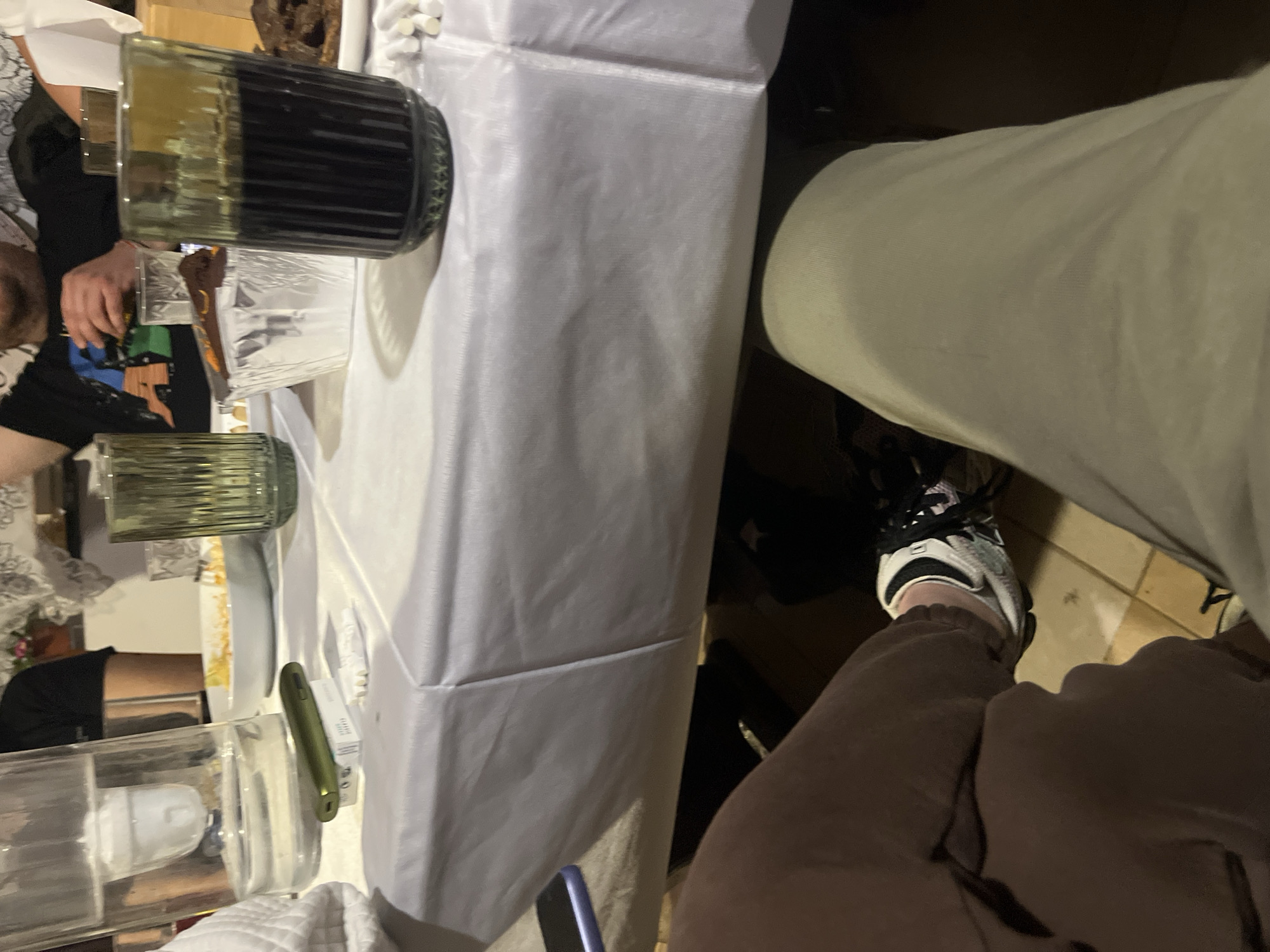 The image depicts an indoor social gathering or meal in Byala, Bulgaria, observed from a seated individual's perspective. The scene is centered on a table covered with a white, possibly disposable, tablecloth. On the table, from left to right: * A clear glass water carafe with an internal filter insert is present. * A lime green vaping device rests on a small white box, possibly for vape pods or cigarettes. Adjacent to these are several white cigarette filters or tips scattered on the tablecloth. * A white bowl containing remnants of orange-colored food is visible further back. * Two ribbed, dark green glass tumblers are on the table; one in the foreground is filled with a dark liquid, while another is partially visible behind it. * A silver foil baking cup holds a dark dessert garnished with orange zest. * To the far right, a white plate contains pieces of dark cake or dessert. * Additional indistinct plates and glasses are visible in the background. Several individuals are partially visible around the table. One person directly across from the photographer wears a black long-sleeved shirt with a multi-colored graphic (appearing to spell "RAGE") and holds a small glass in their right hand. Other partial views of arms and torsos suggest at least two more individuals at the table. The foreground shows the photographer's lower body. The left leg, bent at the knee, wears brown sweatpants and a white athletic shoe with black laces (resembling a New Balance brand). The right leg, extended, wears light green or beige pants. The floor beneath the table is comprised of light-colored tiles. The lighting is artificial, indicating an interior setting.