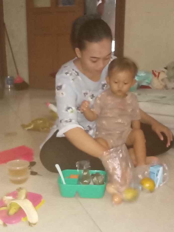 A woman with dark hair sits on the floor, holding a baby on her lap. A variety of items surround them, including a container with small jars, a plastic bag filled with food, a peeled banana on a pink mat, and a cup of liquid. A broom stands in the background near a closed door. The scene appears to be indoors, likely a home.