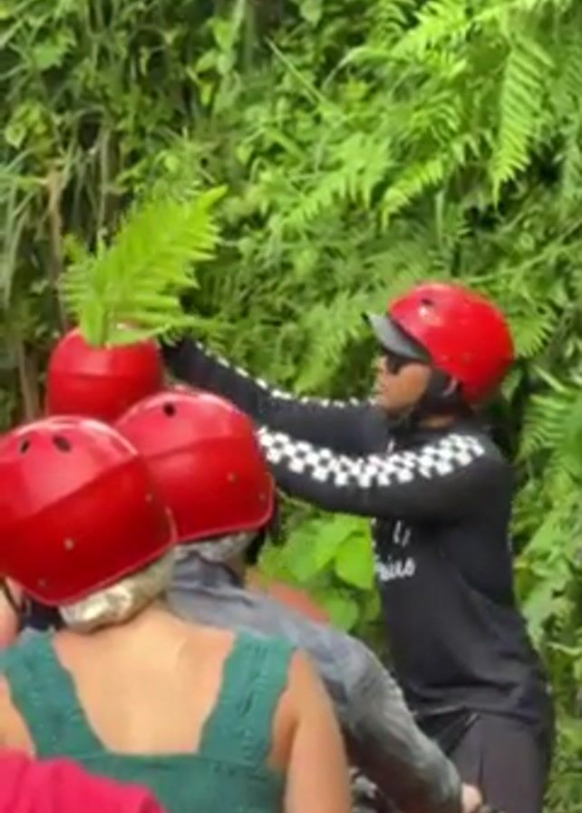 group of people on all-terrain vehicles, wearing red helmets, stopped on a trail surrounded by dense green vegetation. A person wearing a black and white checkered long-sleeved shirt and sunglasses is reaching out to push aside a large fern branch in their path.