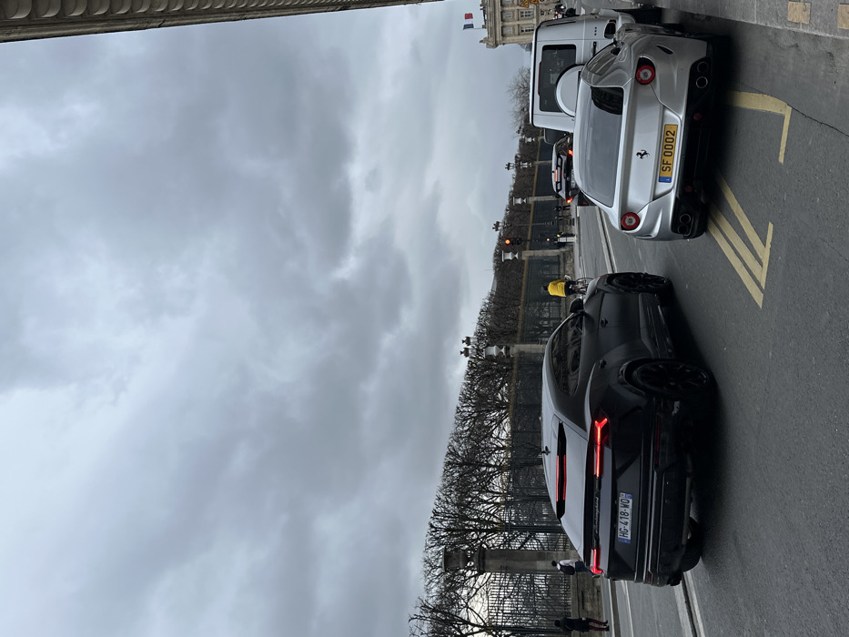 On a city street, a black Lamborghini Urus leads a line of vehicles. A silver Ferrari FF with the license plate "SF 0002" follows. A white van is partially visible behind the Ferrari. The vehicles are parked on the side of the road next to a building with a decorative façade. A row of pruned trees and ornate street lamps line the street's median. The sky is overcast, and the overall scene depicts a Parisian street setting.