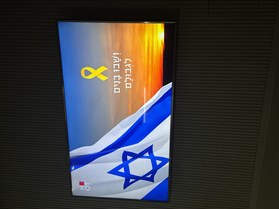 A large, rectangular digital display is mounted on a dark, vertically grooved wall, illuminated from within