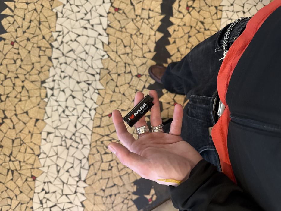 A high-angle, top-down perspective shot captures a person's torso and legs positioned on a mosaic floor. The left hand, adorned with a wide silver ring on the ring finger and two thinner silver bands on the pinky finger, holds a black rectangular object. This object features white text "J' ❤️ BOULOGNE" with a red heart symbol, and "Esprit Royal" in smaller font below. A yellow mark, resembling paint or a stain, is present on the back of the left hand near the wrist. The individual wears a black long-sleeved garment, a black zippered garment over a red garment around the waist, and dark-colored jeans. A silver chain is attached to the right side of the jeans. A brown leather loafer is visible on the right foot. The floor is comprised of a mosaic pattern consisting of irregularly shaped tiles in light beige/tan and off-white colors, arranged in horizontal bands. Darker grout lines separate the tiles, and small, scattered red tile pieces or dots are interspersed within the pattern. This mosaic floor is identifiable as being located within a public space in Boulogne-Billancourt, France, likely a metro station.