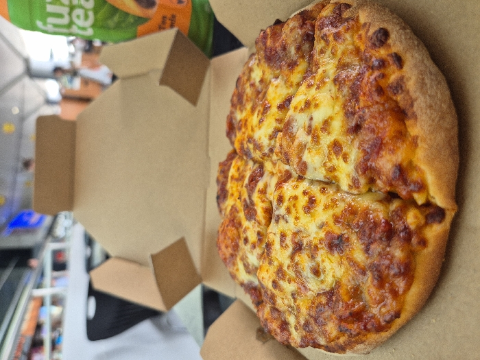 A round, cheese-covered pizza cut into two halves sits within a tan cardboard container. The pizza has a golden-brown crust, bubbly cheese, and appears slightly oily. A green drink container is visible in the upper left corner, partially obscured. A blurred background shows grocery shelves with products and a checkout area, implying the pizza was purchased from a store.