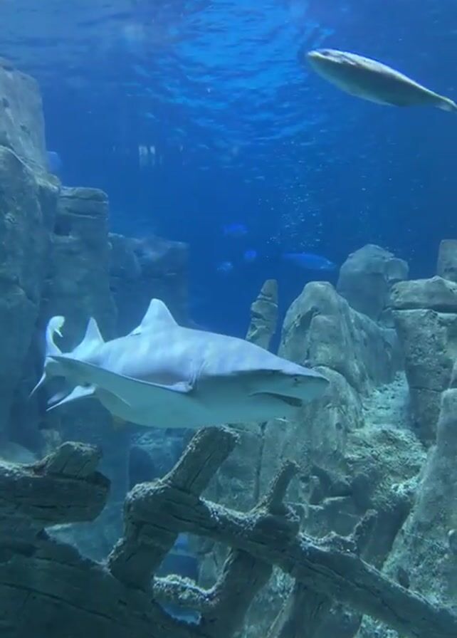 The video depicts a large aquarium with a clear, blue aquatic environment. A large, light gray shark is prominently featured swimming in the foreground. Behind it, the aquarium environment is designed with artificial rocky structures, resembling an underwater cave or shipwreck. Other fish, including sharks, can be seen swimming in the background. The upper area of the tank reveals the surface and glimpses of people looking into the aquarium from above.