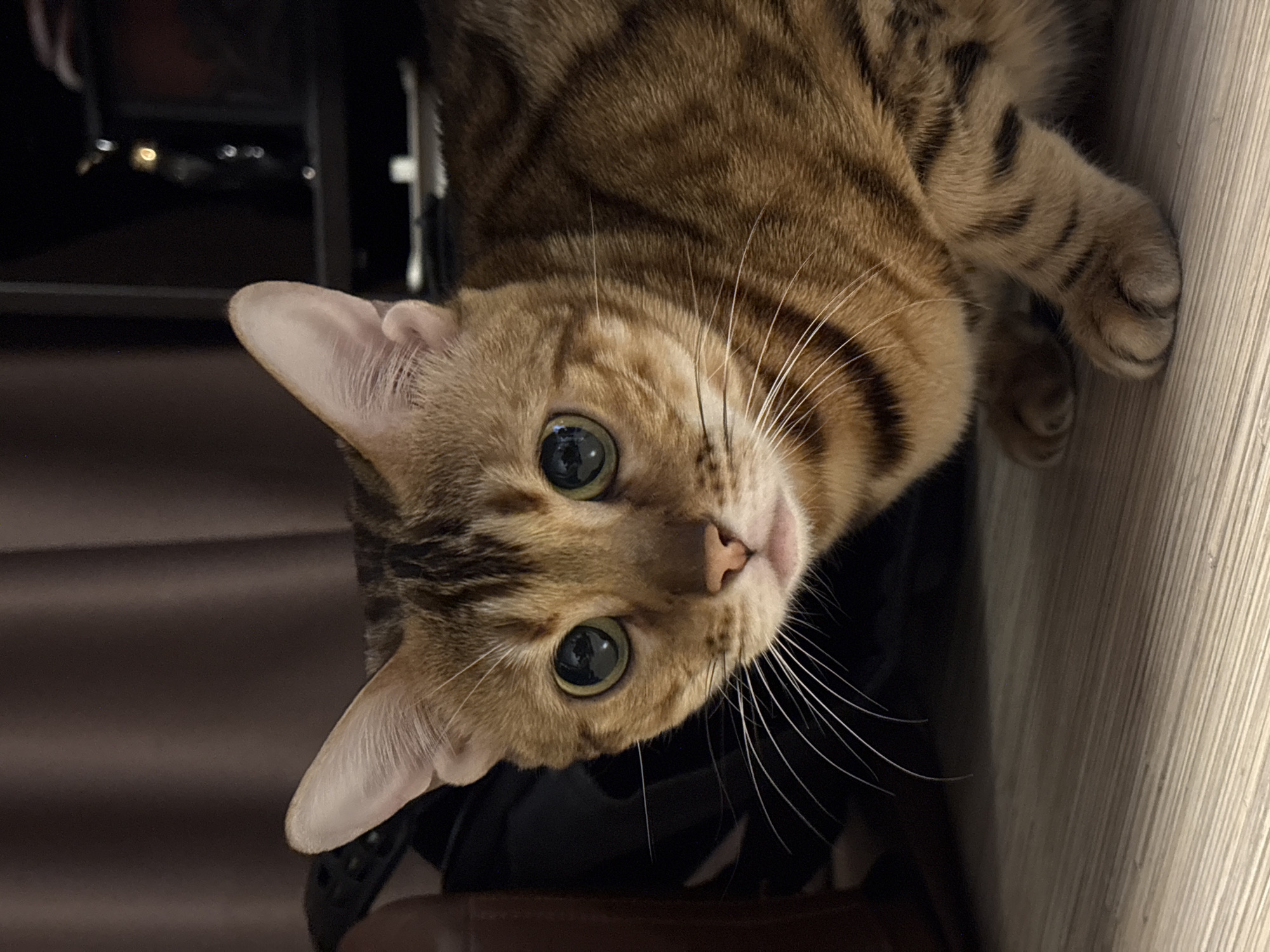 The scene is located in a domestic interior in the city of Krasnoyarsk, Russia. The primary subject is a medium-sized domestic cat, appearing to be a Bengal or a similar spotted/striped breed, positioned low to the ground. The cat features a golden-brown coat with distinct dark brown rosettes and stripes across its body, head, and legs. Its face is characterized by large, round, green-amber eyes with dilated pupils reflecting ambient light, and a pink nose. Prominent white whiskers fan out from its muzzle. The cat's ears are erect and pointed. Its front paws are visible, tucked beneath its body in a crouched or sitting posture, and its gaze is directed forward towards the viewer. The foreground consists of a light-colored wooden or laminate floor with horizontal grain. The background is largely out of focus and dark, revealing a dark brown curtain or fabric in the upper left, and indistinct dark furniture or shelving with faint reflections and a dark, possibly electronic, object in the upper right. No human subjects, specific actions, or interactions are present.