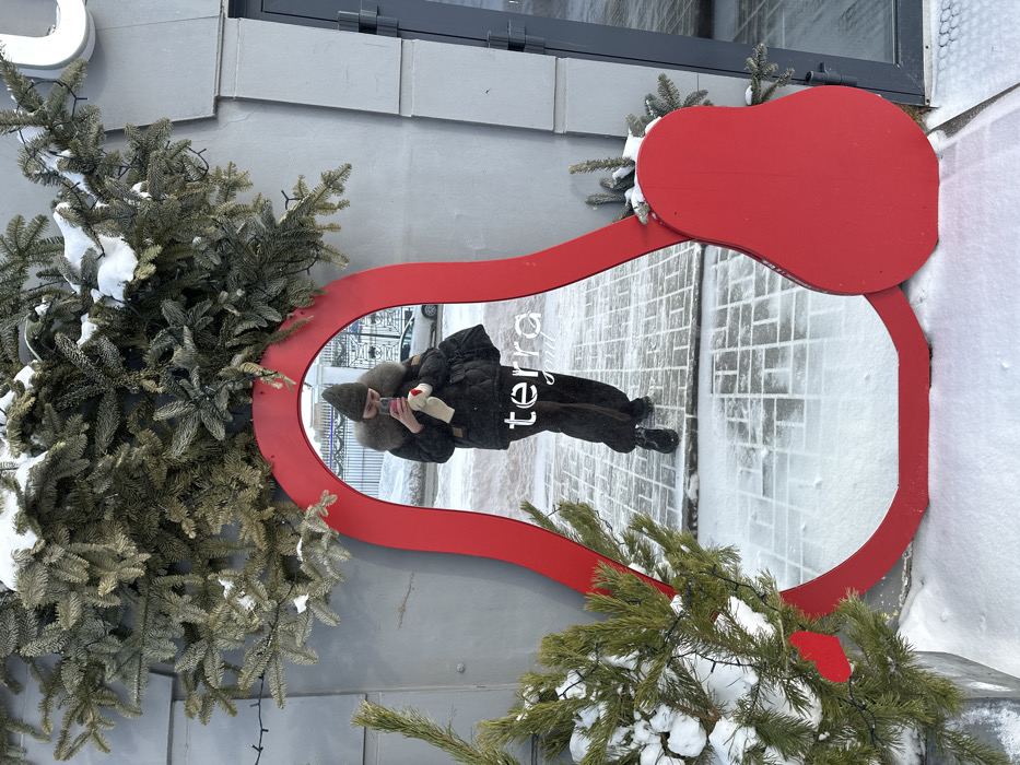 An outdoor winter scene is depicted, situated in front of the "Terra Food" establishment at ulitsa Pushkinskaya, 275A, Izhevsk, Russia. The central focus is a large, irregularly shaped mirror with a thick red frame, resembling a stylized bell or pear. The text "terra good" is visible in white letters across the mirror's surface, reflecting an internal sign. Reflected within the mirror is an individual, identified as an adult female, performing a selfie with a smartphone held in both hands at chest level. She is dressed in a dark winter puffer jacket with a fur-lined collar, dark pants, dark boots, and a grey knitted beanie. Her left hand also holds a small, white, stylized snowman figure. The mirror is positioned against a gray building facade featuring vertical paneling. Above and to the left of the mirror, artificial evergreen branches, dusted with snow and adorned with small string lights, are attached to the facade. To the immediate left, a natural evergreen bush, also lightly covered in snow, sits in a planter, decorated with string lights and a small red heart ornament. The ground in the foreground and within the mirror's reflection is covered in a layer of snow, partially revealing a patterned paved surface beneath. In the background reflection, beyond the individual, further snow-covered ground is visible, along with an ornate dark metal fence or gate, a light-colored building, and a parked white car. A dark gray commercial door is visible on the right side of the image, adjacent to the mirror.