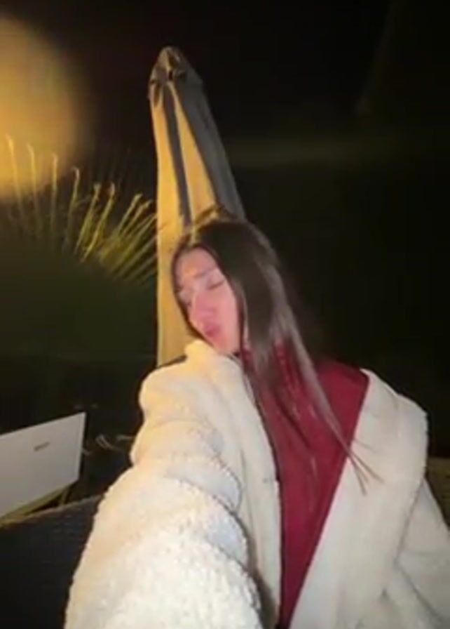A young woman with long dark hair, wearing a red shirt and a white fluffy robe, poses for a selfie outdoors at night. A patio umbrella stands behind her, and greenery is visible in the background. A laptop is on a table next to her. The lighting is dim. She makes a kissy face at the beginning and then smiles at the camera. The camera angle is low, looking upwards.