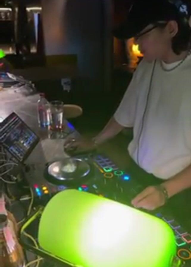 A person wearing a white t-shirt, black cap, glasses, and a silver chain, operates a DJ mixer console in a dimly lit bar or club