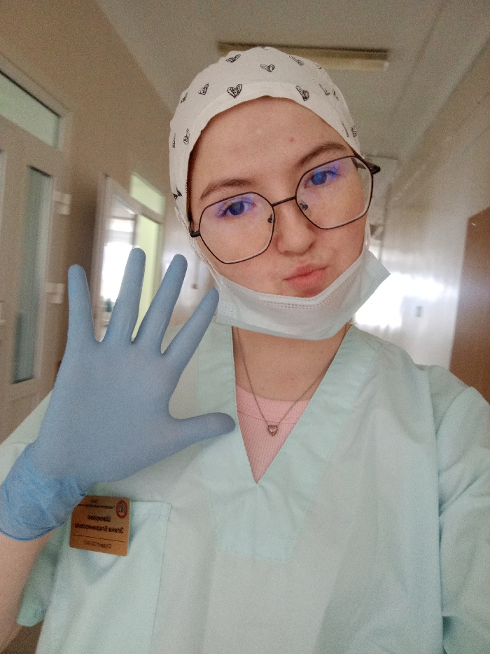 The scene depicts a female individual in a medical facility, identified by the provided context as the city of Kuyeda, Russia. The individual, facing the camera for a self-portrait, wears a white surgical cap adorned with black heart motifs, black hexagonal-framed eyeglasses, and a light blue surgical mask positioned below the chin. Her eyes exhibit a blue hue. She is attired in a light mint green V-neck scrub top layered over a light pink garment, and a silver necklace with a small heart pendant is visible. Her left hand, covered by a light blue latex or nitrile glove, is raised with fingers splayed, palm oriented towards the camera. A brown rectangular name badge, clipped to the left chest pocket of the scrub top, displays Cyrillic text identifying "Зина Габдуллина" and "КГБПОУ Пермский Мед.Колледж". The background comprises a light-colored corridor featuring a fluorescent ceiling light fixture, a doorway with a glass panel on the left, and a solid door on the right.