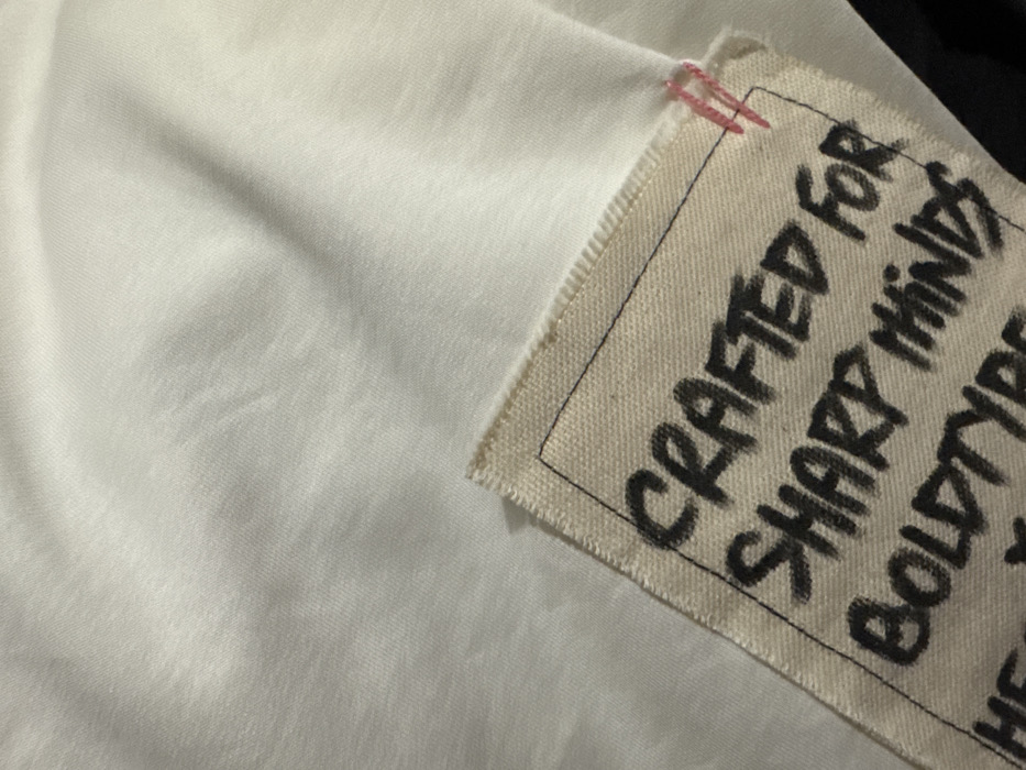 The image displays a close-up, angled overhead view of a beige fabric tag attached to a white, subtly wrinkled textile. The tag is rectangular, outlined with black stitching, and inscribed with black, handwritten-style text. The visible text reads: "CRAFTED FOR SHARP MINDS" and partially "BOLDTYP". A small pink staple or thread secures the upper right corner of the tag to the white fabric. The white textile exhibits minor folds and variations in surface texture. No individuals are visible, nor are any specific actions or interactions occurring. The immediate environment is an indistinct interior setting focusing solely on the fabric and tag. The precise location within the city of Birkova, Bulgaria, cannot be determined from the visual information provided in the image.