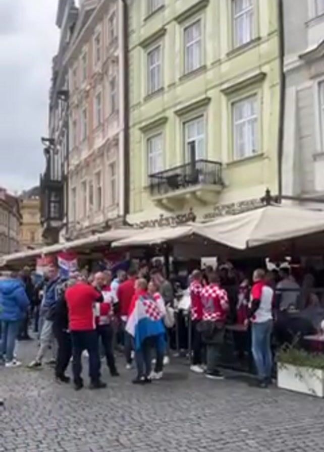 group of people gathered on a cobblestone street in front of a restaurant. Many of them are wearing red and white checkered shirts or carrying Croatian flags. Some people are standing and talking, while others are sitting at tables under the restaurant's awning. The buildings in the background are old and have ornate facades. The sky is overcast.