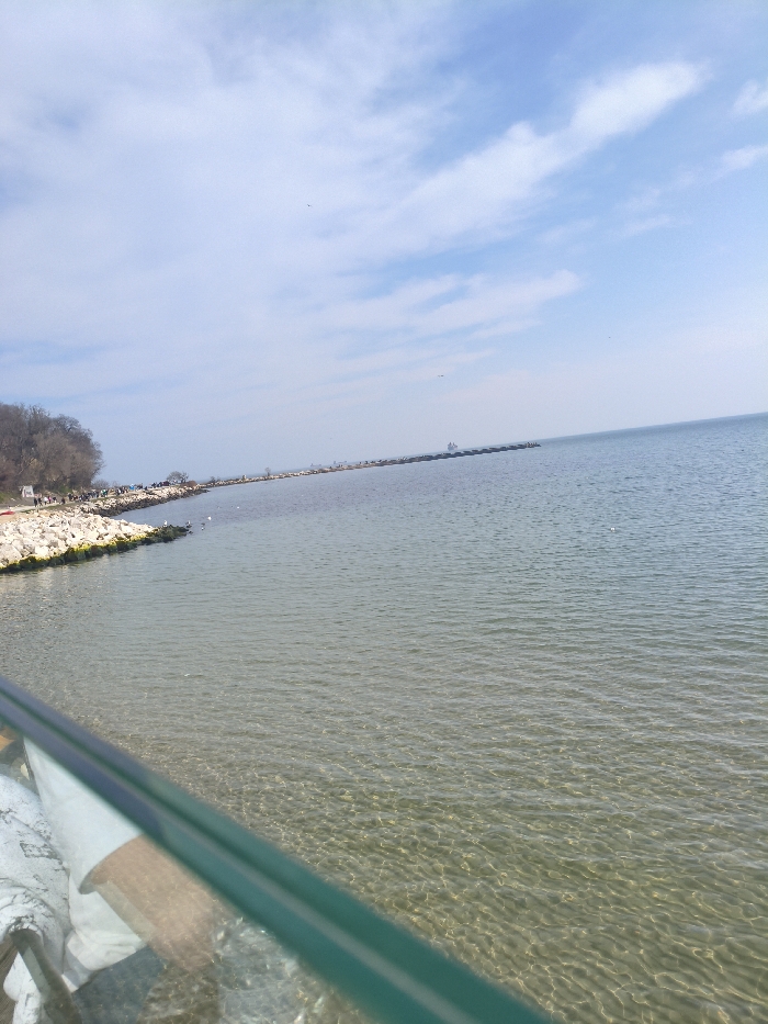 The image depicts a coastal scene in Varna, Bulgaria, specifically along the Black Sea shoreline near the Sea Garden. The foreground features a green-tinted glass railing positioned diagonally across the bottom left, partially obscuring a reflective surface beneath it. The water immediately visible is clear and shallow, revealing the rippled seabed. To the left, a rocky shoreline composed of large white boulders (riprap) extends into the distance, backed by a steep bank covered with dense trees. Numerous individuals, appearing in small groups, are present along this rocky shore, some near the water's edge, engaged in walking or standing. Several gulls are visible on the rocks and in the shallow water. A long, segmented breakwater or pier, dark in color, stretches from the left side of the frame far into the sea. The sea itself is calm, transitioning from a clear, greenish-blue near the shore to a deeper blue further out. The sky above is mostly clear, with scattered white clouds, indicating fair weather. In the distant background, beyond the breakwater, indistinct large vessels or structures are faintly discernible on the horizon.