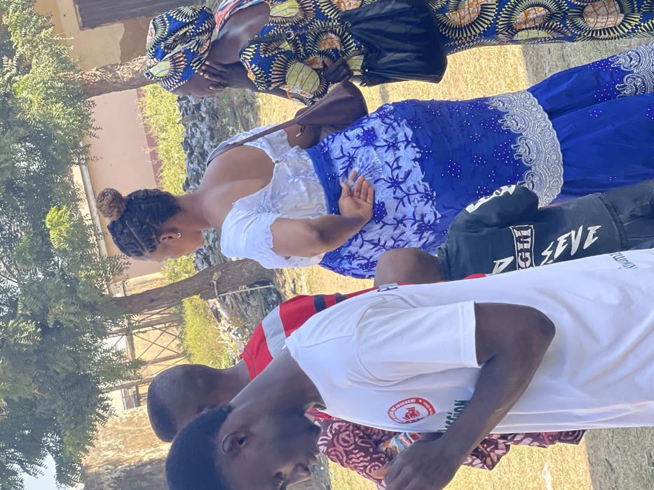 The image depicts an outdoor gathering in Muchiya, Nigeria, under bright daylight conditions