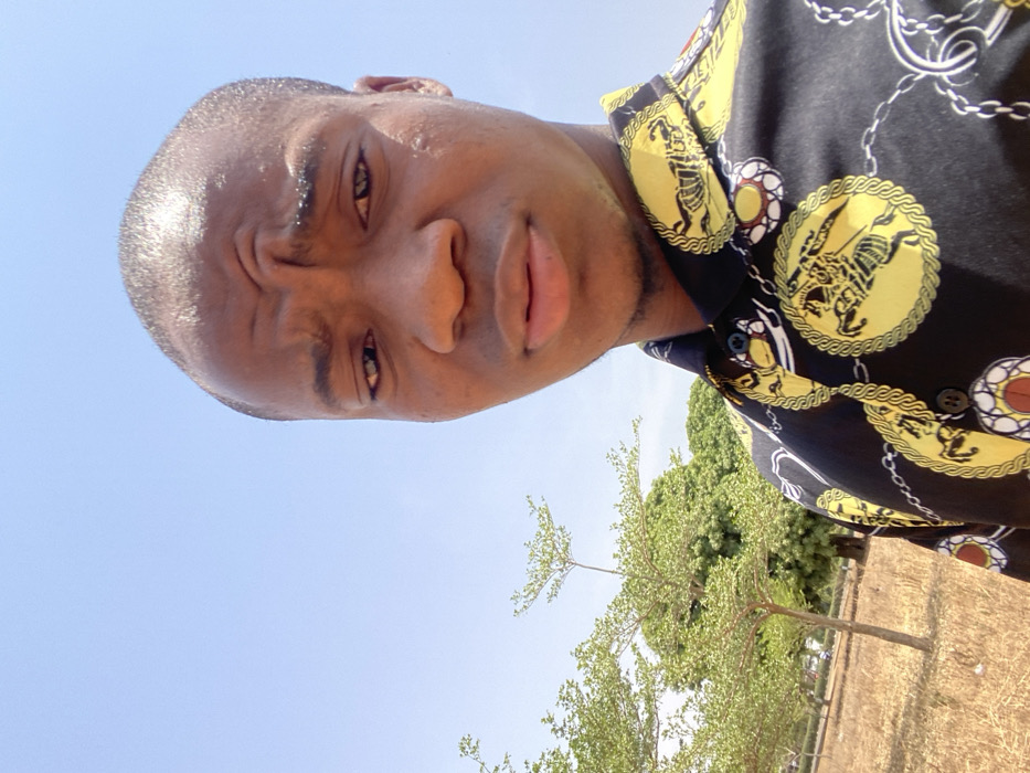 A dark-skinned male subject, approximately 20-30 years old, is captured in a close-up, slightly high-angle shot, looking directly into the camera. He has short, dark hair and prominent wrinkles on his forehead, indicating a slight furrowed brow or squint. His expression is neutral to slightly serious. He is wearing a black collared shirt with a repeating pattern of yellow chains and circular medallions depicting what appears to be a horse and rider motif. The buttons on his shirt are dark. The background consists of a clear, light blue sky occupying the upper portion of the frame. Below the sky, to the subject's left and extending into the mid-ground, are several small trees with light green foliage. Further back, denser green trees are visible. The ground is covered with dry, light brown grass or sparse vegetation. The scene depicts an open, outdoor area, consistent with a park or undeveloped land within a city in Unknown, Nigeria.