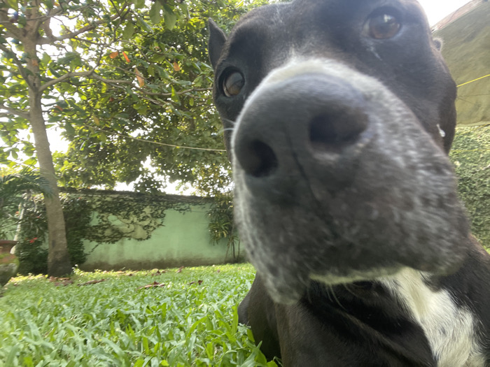 The image depicts a close-up, low-angle view of a domestic dog in an outdoor, residential setting. The dog, a medium-to-large breed with a short, dark brown or black coat, features a prominent white blaze extending from its chest onto its muzzle, which shows signs of graying. Its large, dark nose dominates the central foreground, positioned extremely close to the camera lens. The dog's right eye, brown in color, is visible and appears to be directed toward the viewer. The dog is situated on a manicured lawn of vibrant green grass, which occupies the lower portion of the frame. In the midground, a light green wall, partially covered with dense, dark green climbing vines, spans horizontally across the scene. Behind the wall and to the left, several large trees with lush green foliage are visible, illuminated by bright sunlight, suggesting daytime conditions. A faint, light-colored structure can be discerned in the upper right background. The scene is located in the city of Coatzacoalcos, Mexico.