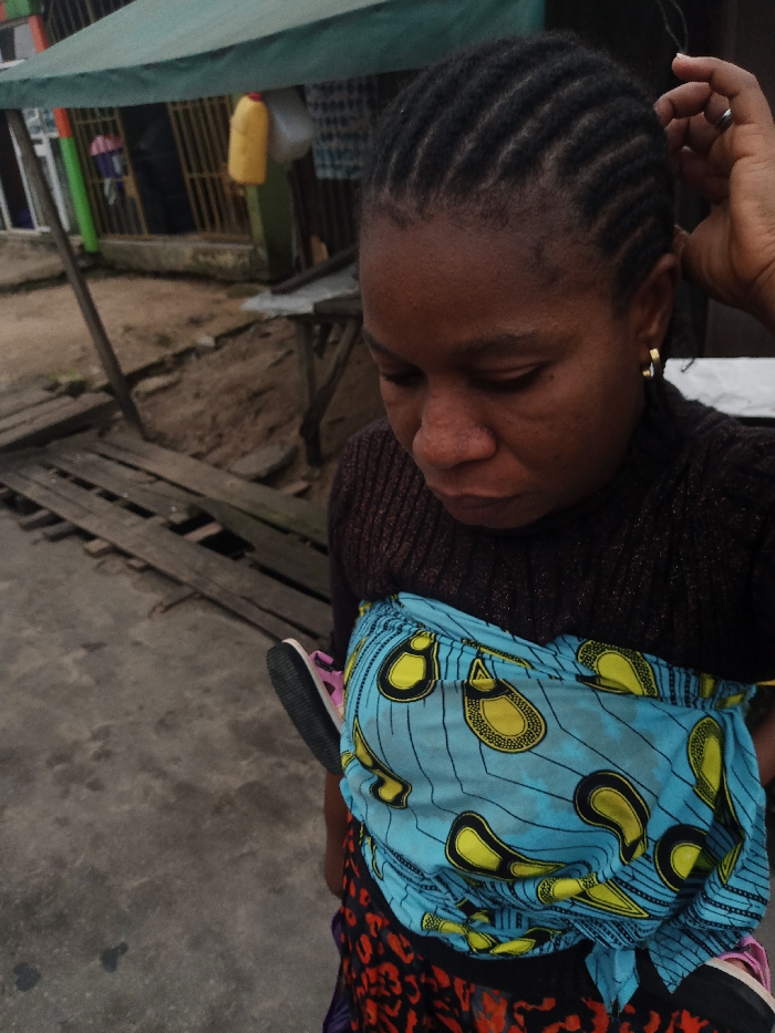 The image depicts an outdoor scene in Umuode, Nigeria. An adult female, with dark skin and braided hair styled in cornrows, occupies the foreground. She wears a dark brown ribbed long-sleeved shirt, a multi-colored skirt featuring red, black, and orange patterns, a gold hoop earring in her right ear, and a silver ring on her left ring finger. Her head is tilted downwards, with her gaze directed to the ground, and her left hand is raised near the side of her head. A child is strapped to the woman's back, secured by a light blue fabric wrap adorned with yellow and black teardrop or paisley patterns. A pink and black sandal is visible on one of the child's feet. The background reveals a makeshift shelter with a green tarp roof supported by wooden poles. Under this shelter, a dirt ground is visible, along with discarded or disassembled wooden planks. A yellow plastic jerrycan and other white fabric items are suspended from the shelter's structure. Further behind, a building with a dark metal security gate is partially visible. The immediate ground beneath the woman and child is grey concrete pavement, contrasting with the dirt area under the shelter.