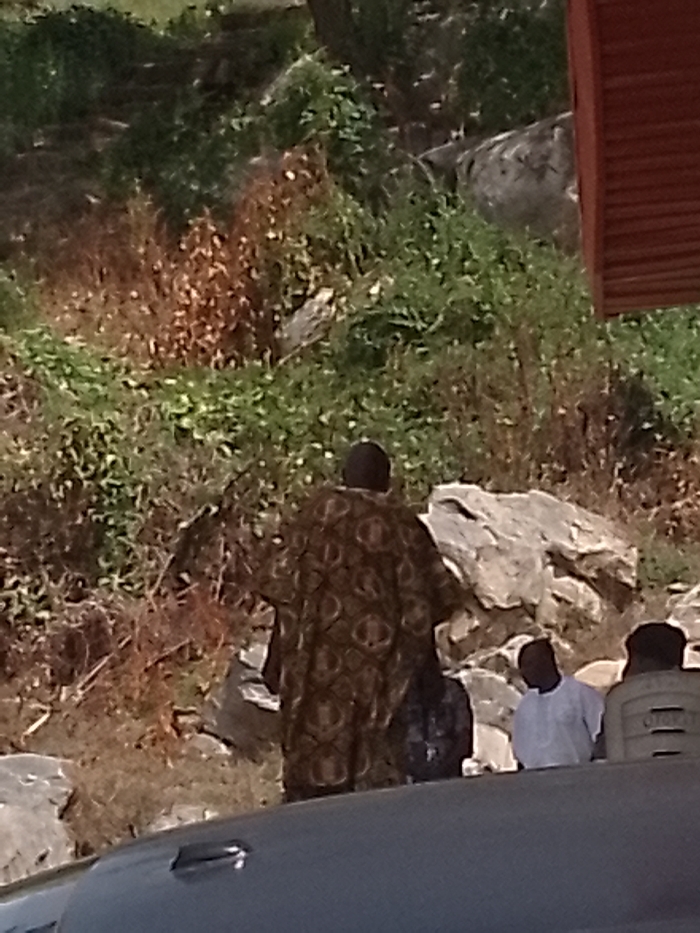 The image displays an outdoor scene in Lokoja, Nigeria, featuring rocky terrain and vegetation. In the immediate foreground, the dark-colored roof of a vehicle, equipped with a visible antenna, occupies the lower portion of the frame. Centrally positioned, a person stands with their back to the viewer, clad in a dark brown garment patterned with lighter circular motifs. To their right, a second individual is partially visible, wearing a white short-sleeved top. Further to the right, a third person's back and head are discernible, with what appears to be the top of a light-colored chair backrest in front of them. The background consists of a hillside or elevated ground densely covered with a mix of green and dry, brown vegetation, interspersed with numerous large, light-grey rock formations. In the upper right quadrant, a section of a reddish-brown structure with horizontal louvers or slats is visible. No explicit actions or interactions are discernible between the individuals.