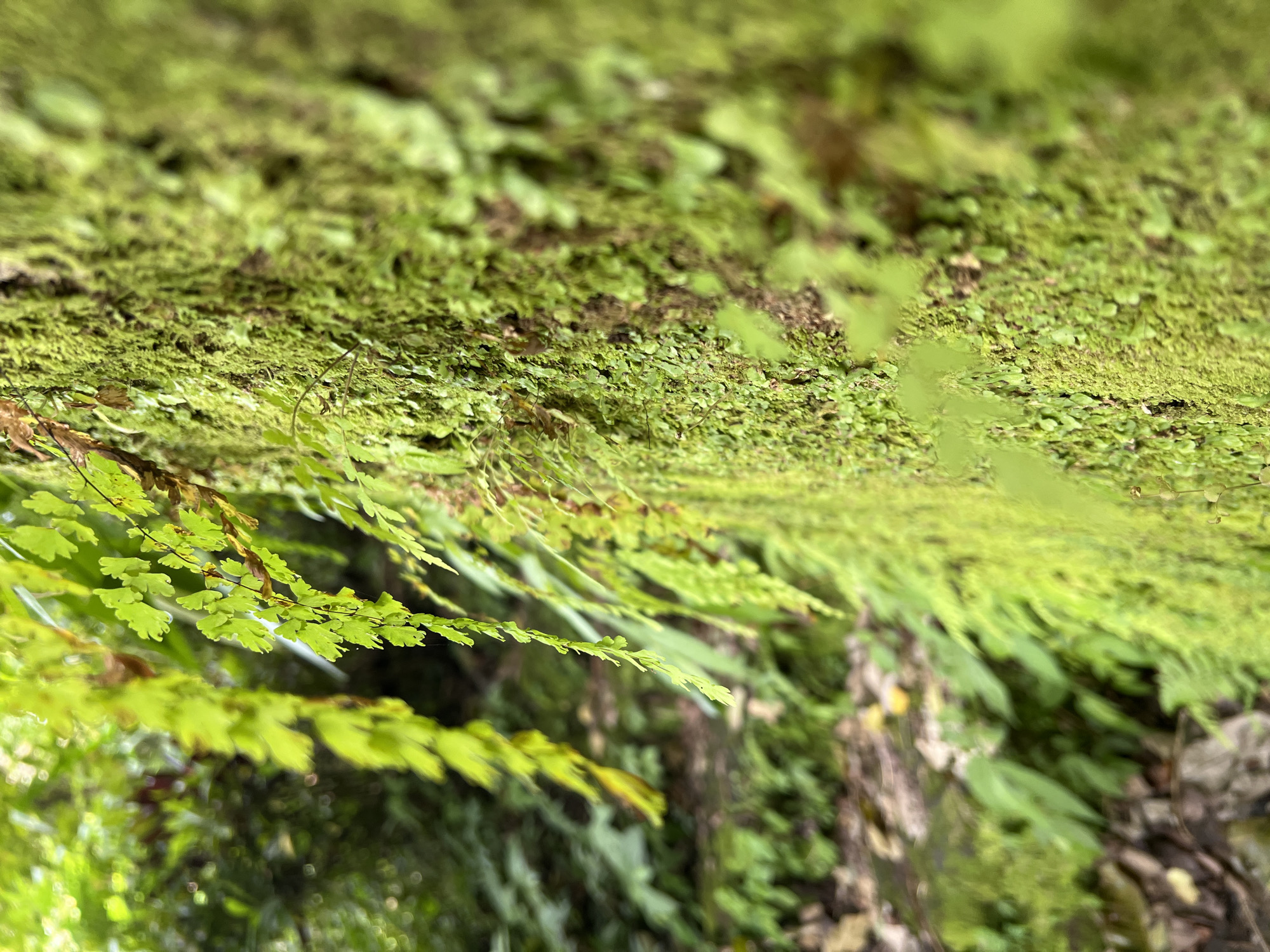 close-up view of a lush, green environment, likely in a forest or natural setting. There are ferns with delicate, fan-like leaves in the foreground, and the background is a dense layer of moss and other greenery. The image appears to be taken at eye level or slightly below, with a focus on the textures and details of the vegetation. Location inferred based on user request.