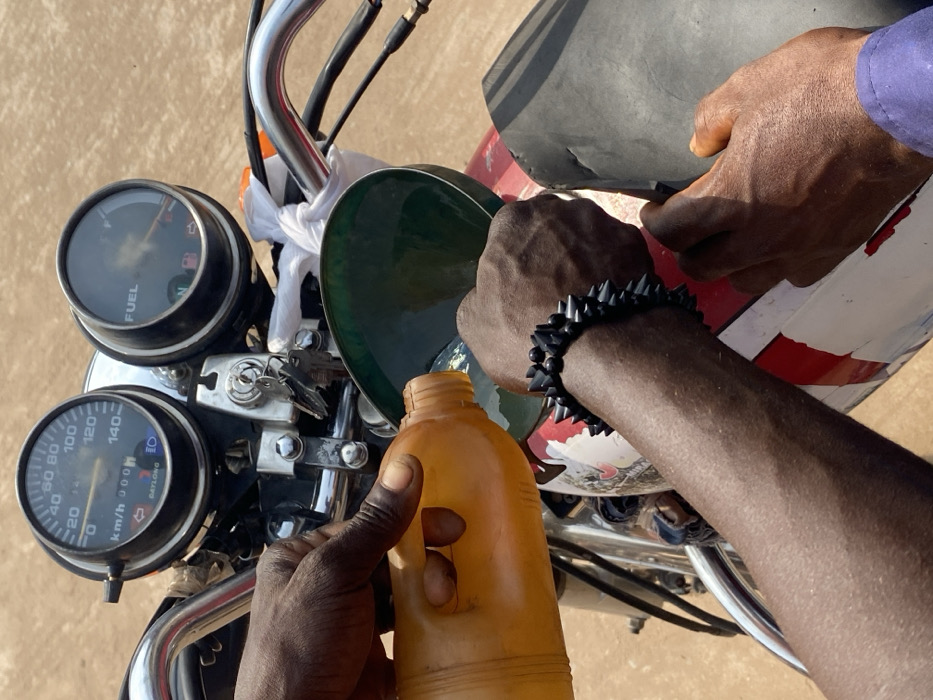 The image displays an overhead perspective of a motorcycle being refueled in Achara, Nigeria