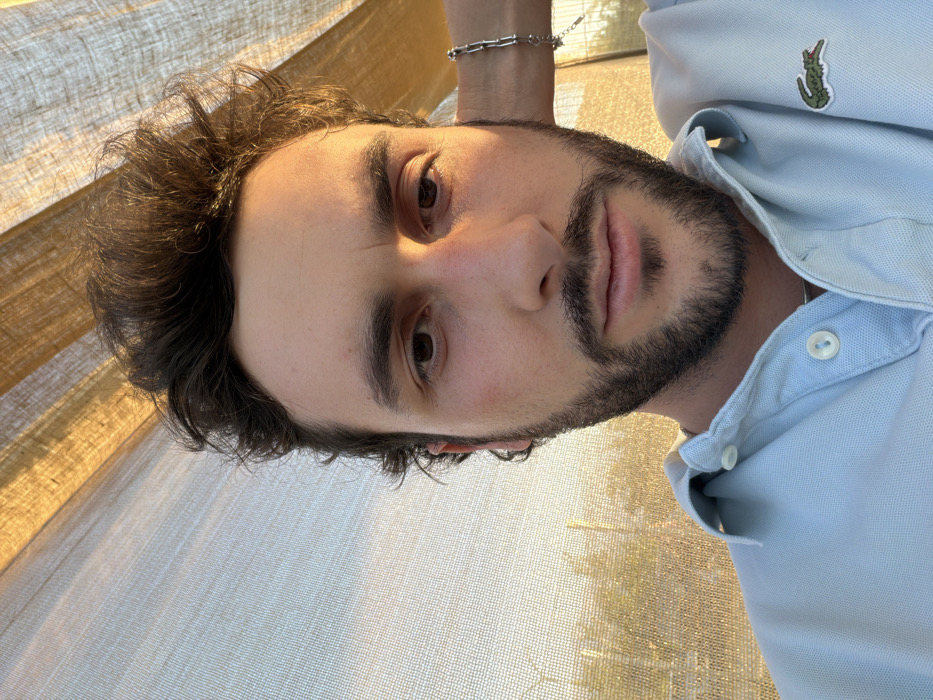 A man with dark hair and a beard poses close-up. He wears a light blue polo shirt with a Lacoste logo. A silver chain is visible on his wrist. The background appears to be a textured, light-colored surface, possibly fabric. The lighting is warm and creates shadows on his face. The camera angle is slightly tilted.