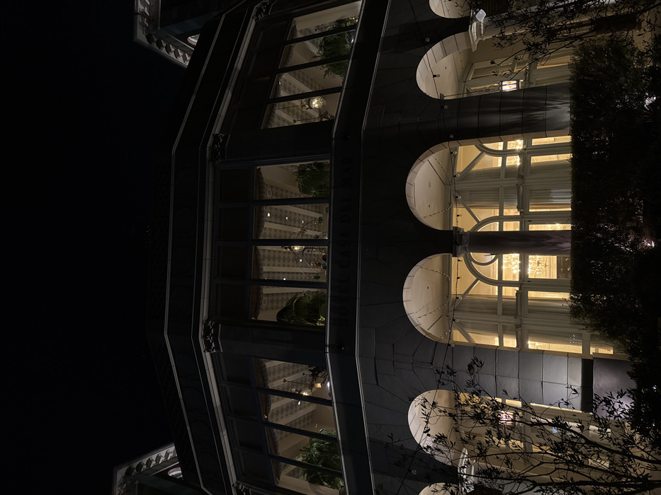 A multi-story building is captured at night, viewed from a low angle. The architecture features a blend of dark, vertical rectangular windows and archways that are illuminated with a warm, yellow light emanating from within. Some archways are obscured by foliage on the right. The sky is a dark void, highlighting the building's illuminated windows and architectural details.