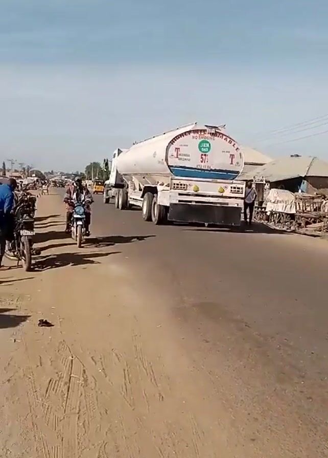 dusty street in what appears to be a rural or developing area. A large white tanker truck with the words "NO SMOKING" visible is traveling down the paved road. On the side of the road, there are stacks of concrete blocks and a couple of men working on a motorcycle. Another motorcycle passes by on the road. Across the road, there are rundown, weathered buildings with corrugated metal roofs. Overhead power lines run along the road. The sky is light blue with a few wisps of clouds.