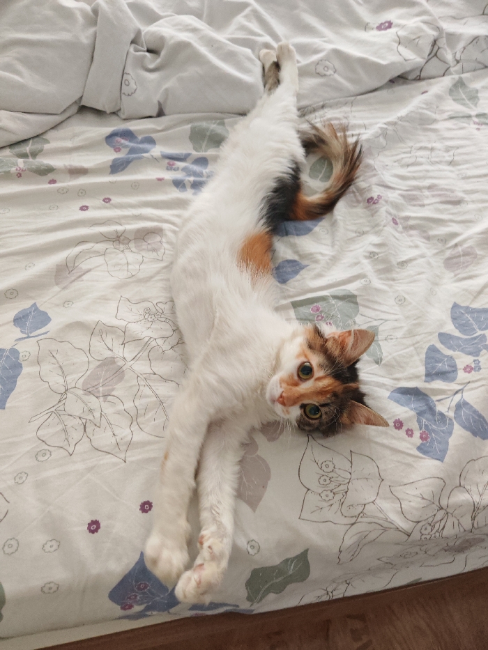 - "A calico cat is depicted stretching on a bed within an unidentified private residence in Etropole, Bulgaria" by FM-tWVs93, licensed under CC BY 4.0