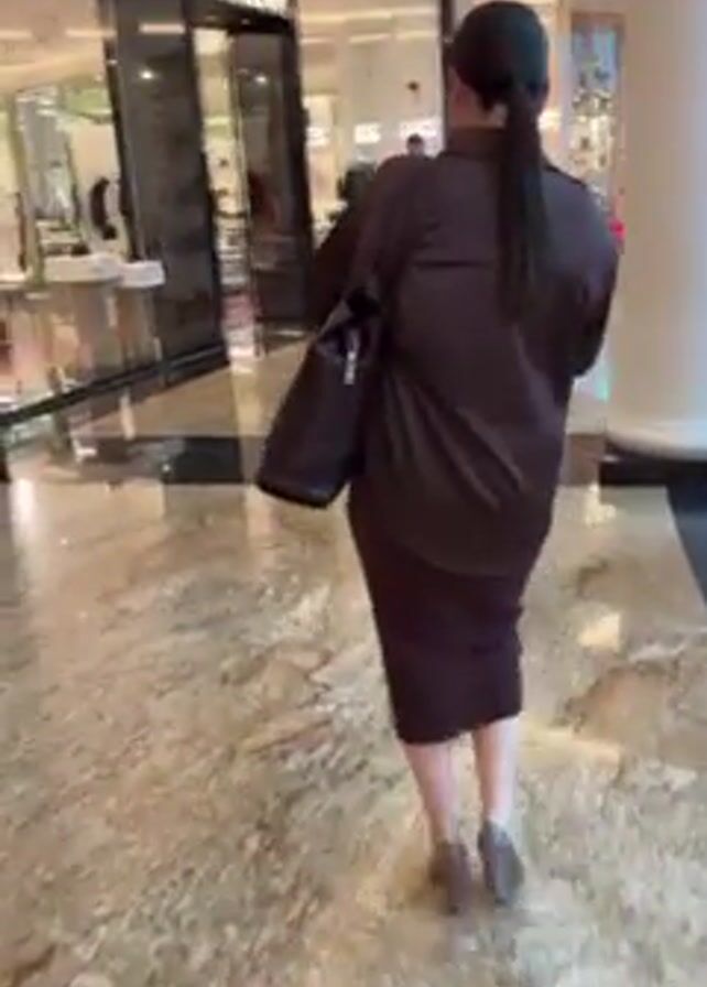 A woman wearing a brown long-sleeved shirt and a brown pencil skirt walks through a shopping mall. She has her dark hair tied back in a ponytail and is carrying a dark-colored tote bag on her left shoulder. She is wearing brown block heels. The floor is a light-colored granite-like material. On either side of the walkway are storefronts, including Givenchy and Valentino. Other people walk past her in the opposite direction.