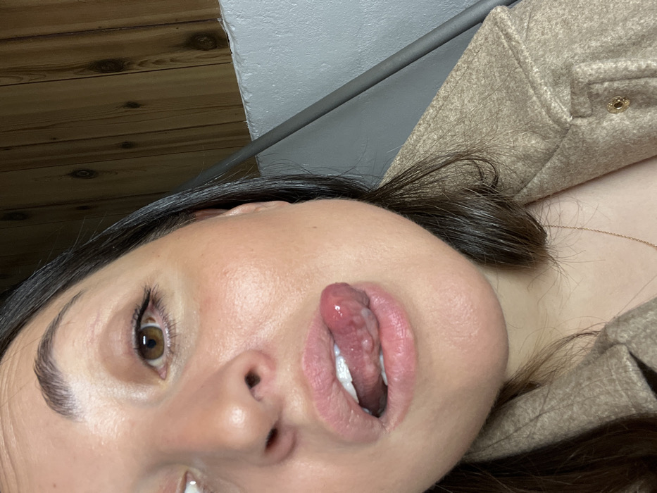 A person's face dominates the image, angled and close-up. Their mouth is open with the tongue extended, appearing somewhat swollen. One eye is visible, featuring lined lashes and a defined brow. A section of a tan-colored jacket is visible in the upper right corner, with dark hair visible behind it. The background includes a wooden planked surface and a light gray area with a metal pipe.