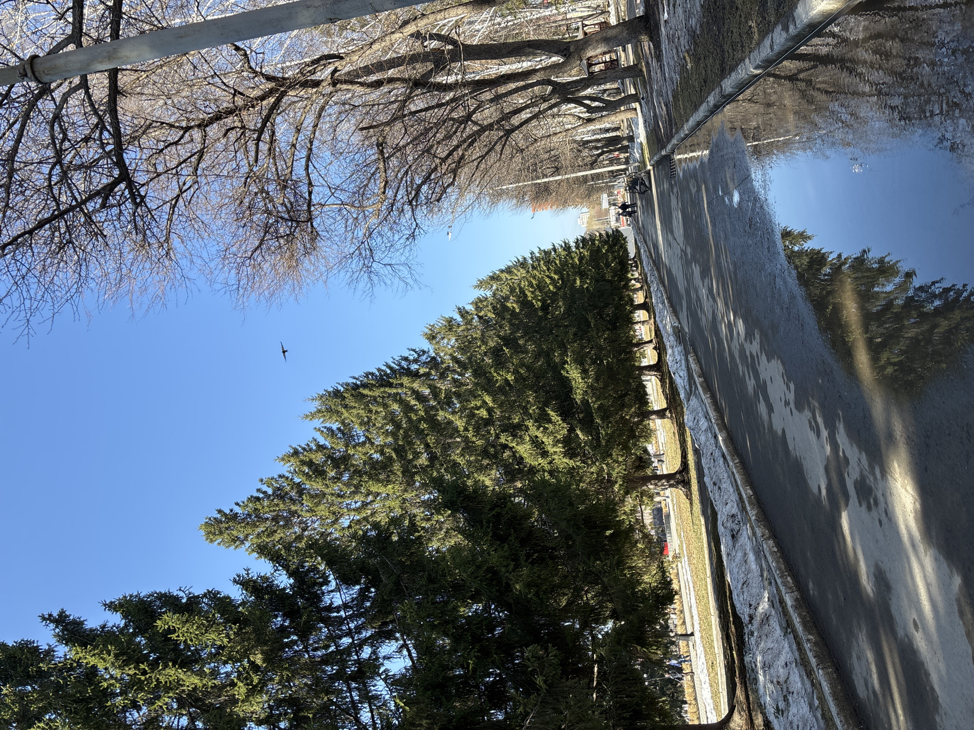The image depicts a street in Yekaterinburg, Russia, notable for a reflective surface that mimics a body of water, possibly due to melting snow or ice. A bare tree canopy extends overhead, contrasting with a dense evergreen tree along the lower left. A bird is visible in the clear blue sky. A sidewalk runs parallel to the 'water' reflecting the trees and sky. People are walking in the distance. A low wall separates the walking surface from a grassy area dotted with trees.