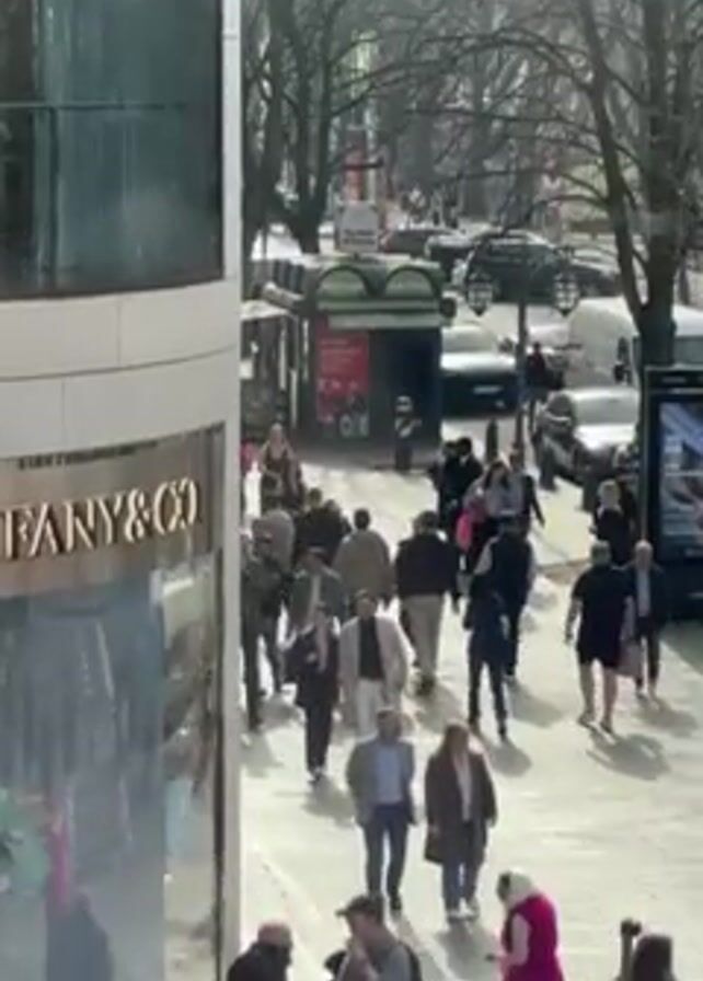 busy pedestrian zone in a city. The Tiffany & Co. store is visible on the left. There are many people walking along the wide sidewalk, some are dressed casually, and others in business attire. The street is lined with trees, and there are cars and vans parked on the other side of the sidewalk. There's a green structure that appears to be a bus stop or information kiosk in the middle distance. The weather looks sunny and bright.