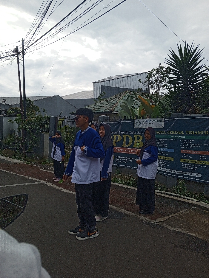 A group of four young people wearing matching blue and white outfits stand in a row on the side of a street. The first person is a boy, and the other three are girls with hijabs. Behind them is a fence with a banner that reads "SKPLAADOA SAH imaan Peserta Didik Baru PDB in Haran 2025-2025 AQWA, CERDAS, TERAMPIL." The banner also includes text about school activities. The sky is cloudy, and there are some buildings in the background.