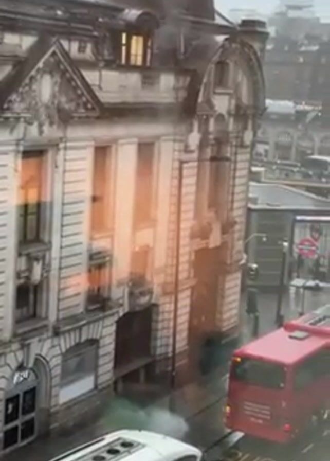 n overcast, rainy day in what appears to be a city. The camera is positioned indoors, likely behind a window, overlooking a street scene. The prominent features include a red double-decker bus parked on the right side of the street and a white van or bus in the foreground to the left. The street has markings indicating a bus stop. Across the street is a building with ornate architectural details and a number on the front door that looks like 158. Further down the street is the entrance to Victoria Underground Station, displaying the iconic London Underground logo. Pedestrians can be seen walking towards the station. The general ambiance suggests a typical rainy day in London.