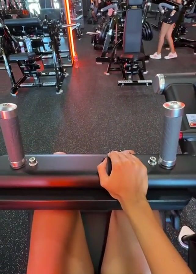 person at the gym exercising. The camera is positioned from their point of view, showing their legs positioned on a machine, with their hands gripping the handle. The camera then pans to the right to show a young woman in activewear sitting on the same machine. She glances at the camera while exercising. The gym appears to be modern with plenty of equipment. The gym lighting is a warm hue.