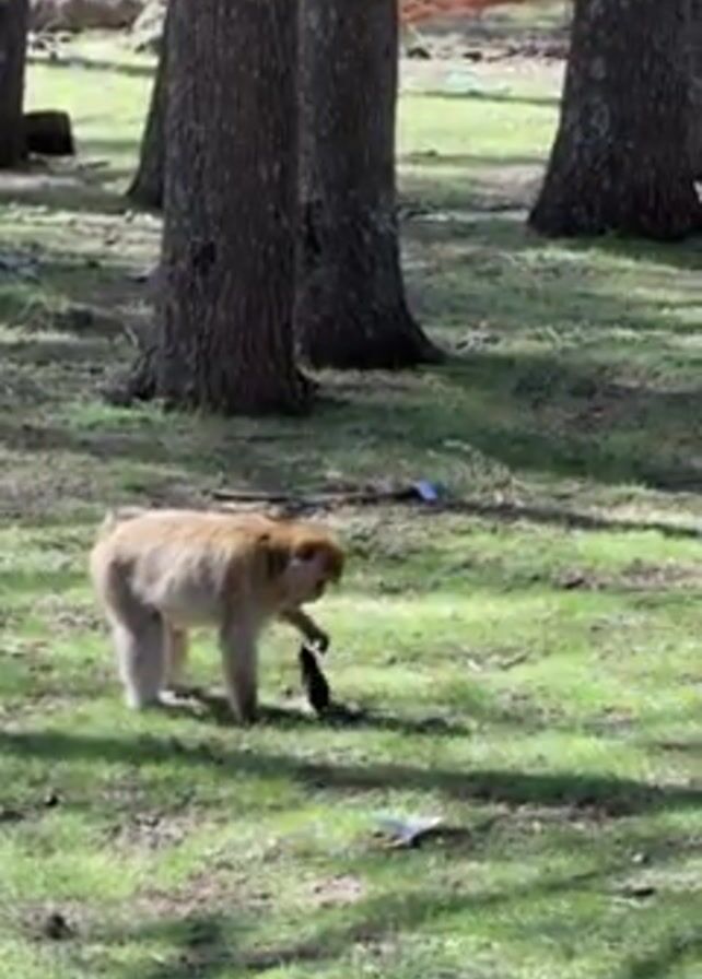 Barbary macaque walking on grass in a forest. The monkey has a light-colored coat and is moving across the frame from left to right. There are several tall trees with thick, textured bark scattered across the grassy area. In the background, people are visible in the distance. Small pieces of trash are scattered on the grass. The scene appears to be a sunny day in a park or forested area.