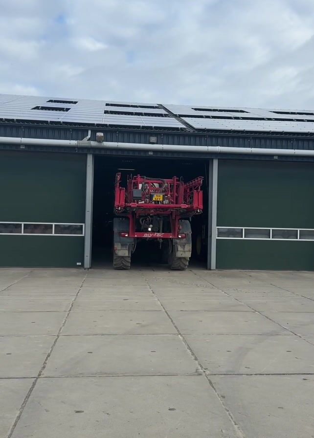 A red Agrifac sprayer slowly reverses out of a large garage with green roll-up doors. The garage has solar panels on its roof. The sprayer has a yellow license plate that reads TKK-53-V. The garage floor is made of concrete. The sky is cloudy.