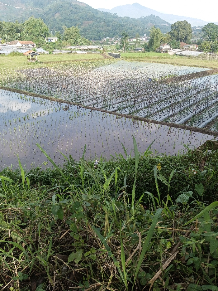 A waterlogged field of planted rows reflects the sky above, interspersed with thin supports. Verdant vegetation fills the foreground, a mix of grasses and leafy plants. Distant buildings dot the landscape, fading into rolling hills under a cloudy sky. The scene exudes a humid, rural atmosphere, blending agricultural cultivation with natural growth.
