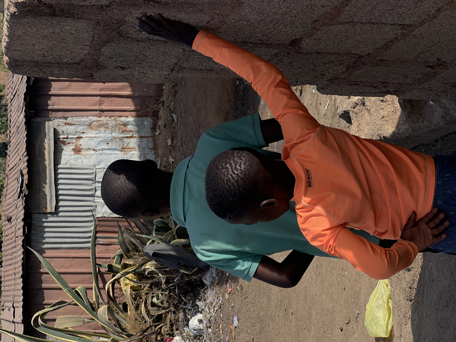 The image depicts two individuals, likely males, in an outdoor setting in Udu, Nigeria. In the foreground, a young person with short, dark hair wears a long-sleeved orange top with "BEACH ESCAPE" printed on the back and dark patterned bottoms. This individual leans against a textured, light grey concrete block wall on the right, with their left arm extended against it and their right hand resting on their lower back. Directly behind them stands a taller individual, also facing away from the camera, wearing a short-sleeved, light teal polo shirt and dark trousers. The ground is unpaved, consisting of dry, light brown dirt, with a crumpled yellow plastic bag visible on the left. In the background, two structures constructed from weathered and rusty corrugated metal sheets are visible. To the left of these structures, large, spiky green plants (resembling agave) grow amidst dry vegetation and scattered debris, including a dark piece of clothing draped over a plant. The scene is illuminated by natural daylight, casting shadows.
