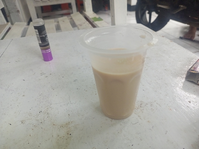 A static scene is observed on a light-colored, textured surface with dark stains and specks, located in Ciherang, Indonesia. A clear plastic cup, approximately half-full with an opaque, light brown liquid containing visible ice, occupies the right foreground. It has a flat, clear lid with a small opening. To the left of the cup, a cylindrical item, identified by a label as a "Mercedes-Benz" product, stands upright; it features a clear upper section, a black label, and a metallic purple base. In the background, a white slatted structure is partially visible to the left. To the right, a dark motorcycle wheel and fender are present, alongside a bare human foot on what appears to be a tiled floor. A torn wrapper or paper object is partially visible on the far right edge of the surface.