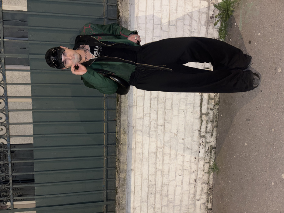 A full-body photograph depicts a single individual standing on a paved surface in Asnières-sur-Seine, France. The individual, appearing male, is positioned centrally, facing the camera directly. They wear a black baseball cap, dark sunglasses, a dark green jacket, a black hooded garment, and a black tank top with white lettering. Multiple silver-colored chains are visible around the neck, and rings adorn the fingers of the right hand. The individual wears baggy black trousers with a visible drawstring and dark, possibly chunky, shoes. A black crescent-shaped bag is slung over their left shoulder. The individual holds a lit cigarette or similar object between the thumb and forefinger of their right hand, with a plume of smoke emanating from their mouth. Behind the individual is a low white brick wall, exhibiting some discoloration and minor vegetation growth at its base. Above this wall is a dark green metal fence or gate composed of vertical bars and a decorative top rail. The ground is dark asphalt or concrete, with minimal plant growth visible. The scene is illuminated by artificial light, suggesting a nighttime setting.