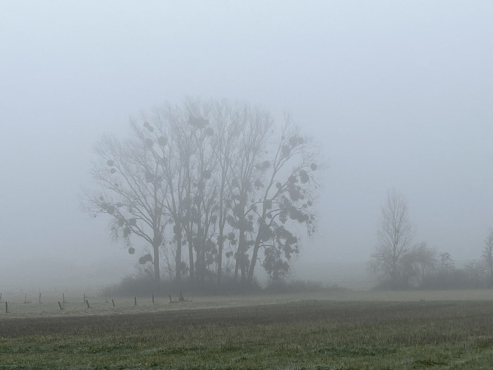 The image displays a rural field in Mondercange, Luxembourg, enveloped in dense, light-grey fog that severely limits visibility. The foreground and midground consist of a flat expanse covered by low-lying, sparse vegetation in dull green and brown tones. In the left midground, approximately 8-10 dark, slender wooden fence posts are sparsely arranged horizontally across the field. The central feature is a cluster of 6-8 bare deciduous trees, their branches heavily laden with numerous dark, spherical clumps of mistletoe. A single, smaller, bare deciduous tree is partially visible further back and to the right of the main tree cluster. The pervasive fog creates a monochromatic atmosphere, obscuring the background entirely. No individuals, animals, or structures are present.