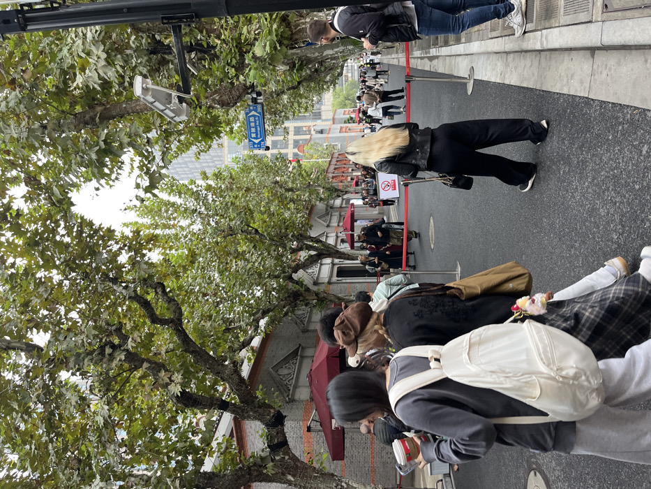 A street scene with people queuing on a road lined with trees. A long red velvet rope divides the street, guiding the crowd. Buildings with red awnings are visible along the side. A blonde woman in black stands on the right, and a group of people with backpacks and casual wear are closer to the camera. A street sign is visible amidst the foliage. The sky is overcast.