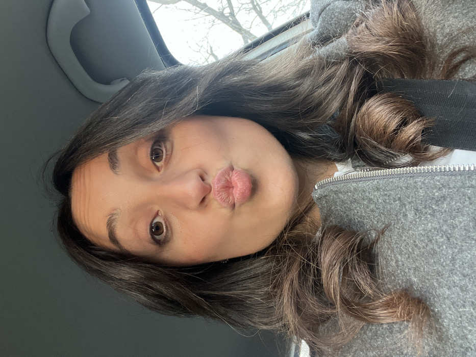A selfie shows a woman with long, wavy dark hair styled over her shoulders. She is wearing a gray zip-up jacket and a white shirt underneath. Her face is turned slightly, and she is puckering her lips in a kiss. The image appears to be taken inside a car, with part of the vehicle's interior visible in the background. The light is soft and diffused.