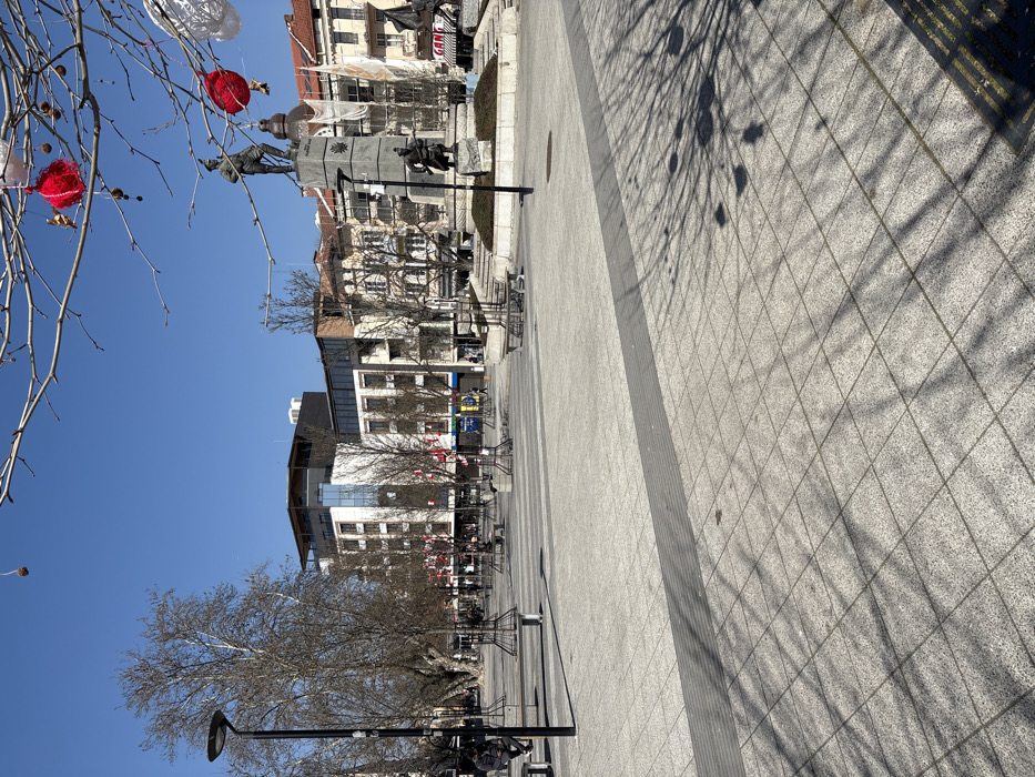 The image displays a brightly lit urban square in Pleven, Bulgaria, featuring the Monument to the Liberators (Паметник на Освободителите) under a clear blue sky. The ground is paved with light-grey and darker-grey rectangular tiles, exhibiting strong, distinct shadows cast by deciduous trees, indicative of a sunny day. In the upper foreground, bare tree branches are adorned with red and white spherical decorations, and a single sycamore seed pod. A tall, black lamppost is positioned on the left. Several light-colored public benches are present throughout the square. One individual in dark attire is seated on a bench in the far left foreground. Multiple indistinct figures are visible walking or standing in the middle distance, primarily near the background buildings. The Monument to the Liberators dominates the right midground. It consists of a stone pedestal topped by a statue of a soldier holding a rifle, with additional sculptural figures at its base, all set within a low, landscaped circular area. Behind the monument and extending across the background are various multi-story buildings. These include a modern structure with a dark upper level and glass facade on the left, and older, classical-style buildings featuring windows, balconies, and red-tiled roofs further right. Scaffolding is visible on the upper portion of a building to the right of the monument. A partial sign displaying "GANG" in red lettering is visible on one of the background buildings. Smaller, bare trees, some supported by metal frames, are scattered across the paved area.
