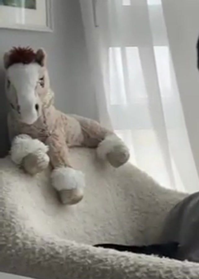 close-up of a plush horse toy lying on a white, furry chair. The horse has a white face, brown mane, and shiny gold accents on its hooves and collar. Behind the chair is a window with white curtains and a picture frame on the wall. In the foreground, a marble-like surface holds a red perfume bottle, a lipstick tube, and other cosmetic items. A lighting fixture is partially visible on the right side of the frame.